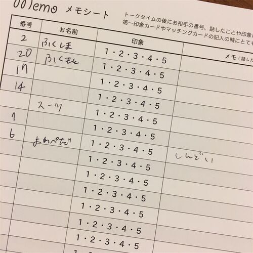 20:20の街コンに行きました。会場は少し大きめの会議室みたいな所で其処にテーブルと椅子が置かれ男女男男女男女…ではなくて男、女、男、女、と交互の順で座っていきます。まず、会場入る際に受付を済ませてからスタッフに案内されてテーブルへ。テーブルの…